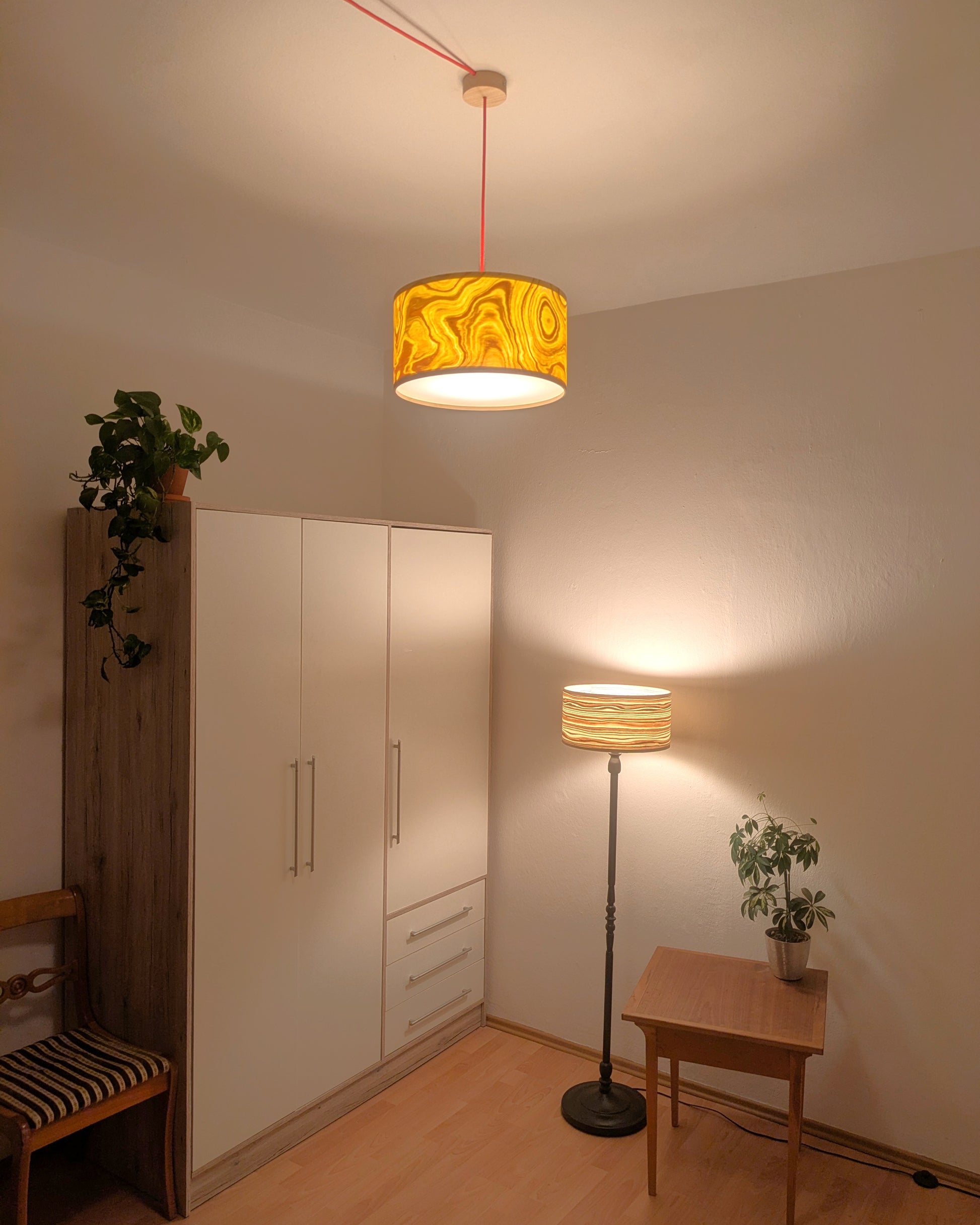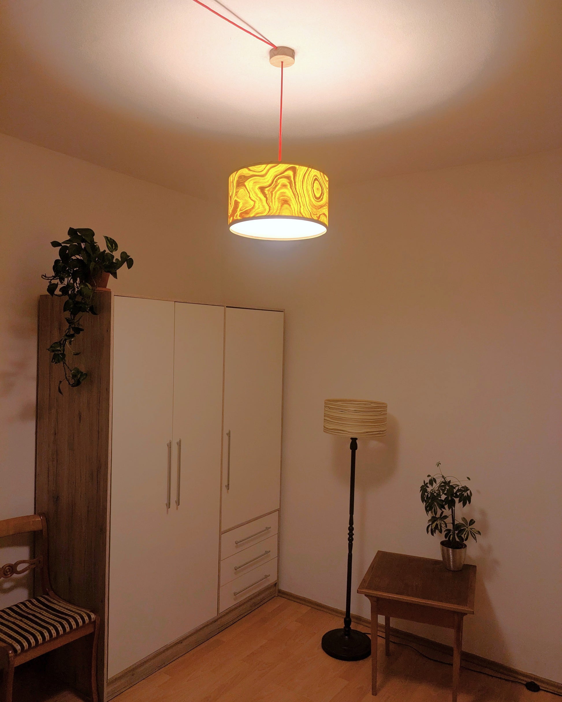 Furnierlampe mit olivgrüner Maserung – als Hängelampe oder Stehleuchte geeignet
